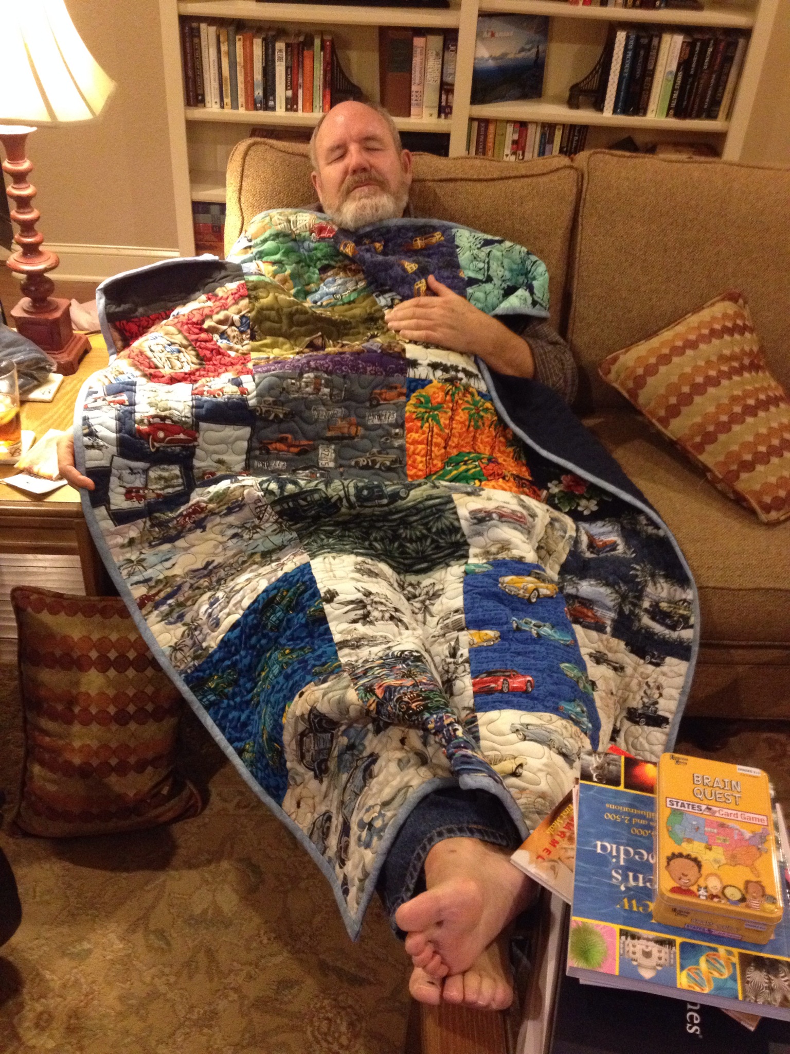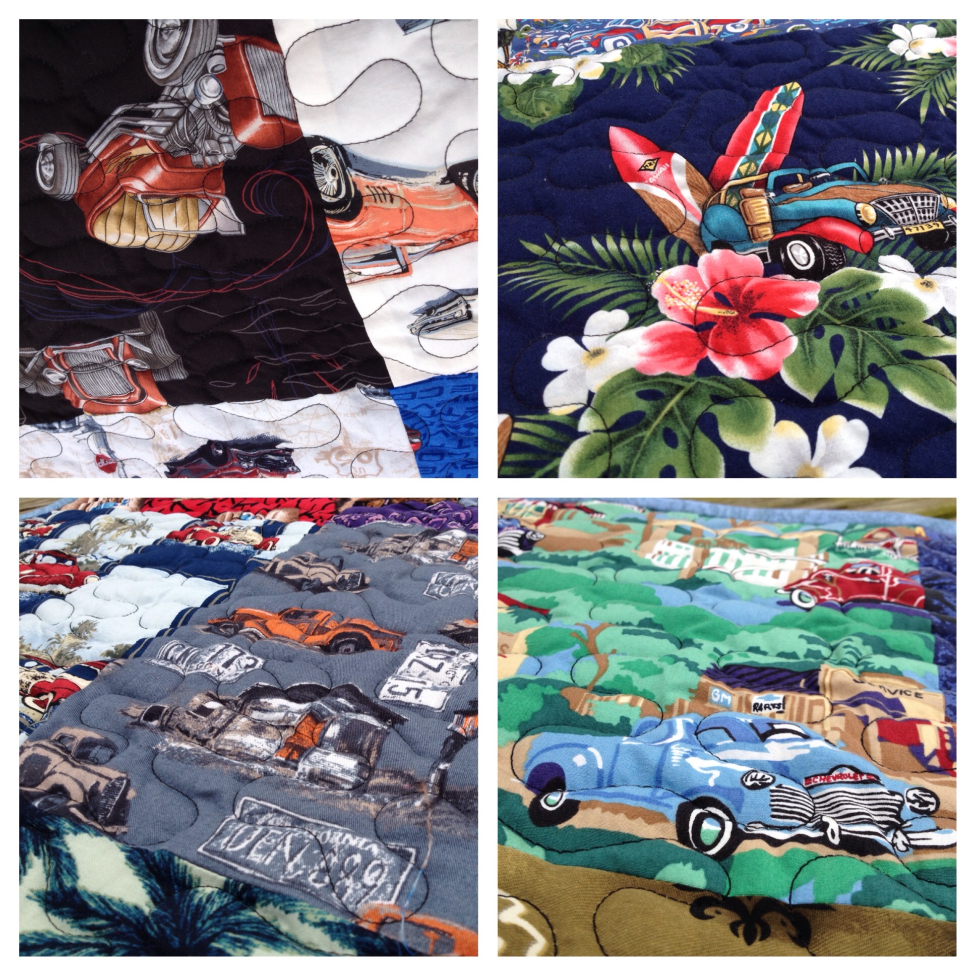 When I was a teenager, someone gave my dad a Hawaiian shirt with cars on it. That was the start. Over the years, he received more Hawaiian car shirts until he had quite the collection. Dad teaches high school auto mechanics and started wearing the shirts on days he was giving a test. Students would see him walking down the hall, wearing a bright flowery shirt with Corvettes, and lament about how they forgot about the test and weren’t prepared. The shirt collection continued for a number of years until the high school went to a more “standardized” faculty dress code. At that point, the shirts were boxed up and put in the attic. A few months ago, Dad gave me the box, thinking I might be able to do something with them.
